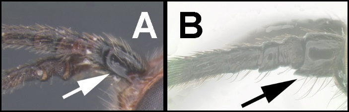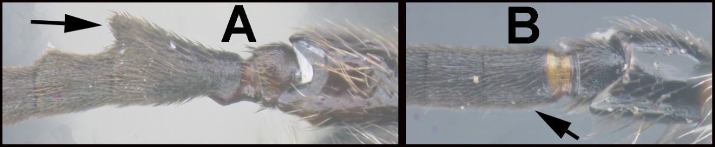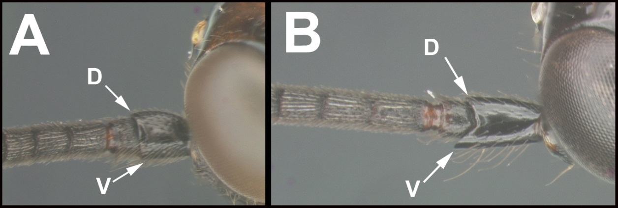Diagnosis. Scape shorter ventrally than dorsally; flagellum uniformly dark, without white or cream-colored band at mid-length. Basal flagellomere expanded ventrally.