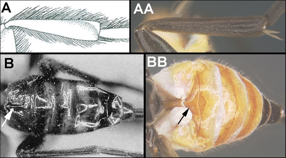 Diversity. At least 5 described species; a very variable genus as currently defined, some species have well-developed midlongitudinal grooves on median tergite 1, some have claws with rounded basal lobes, some have pale-striped antennae, some have the metasoma distinctly sinuous in dorsal view, and some have the suture between metasomal terga 2 and 3 strongly buckled medially. This is likely a polyphyletic group.